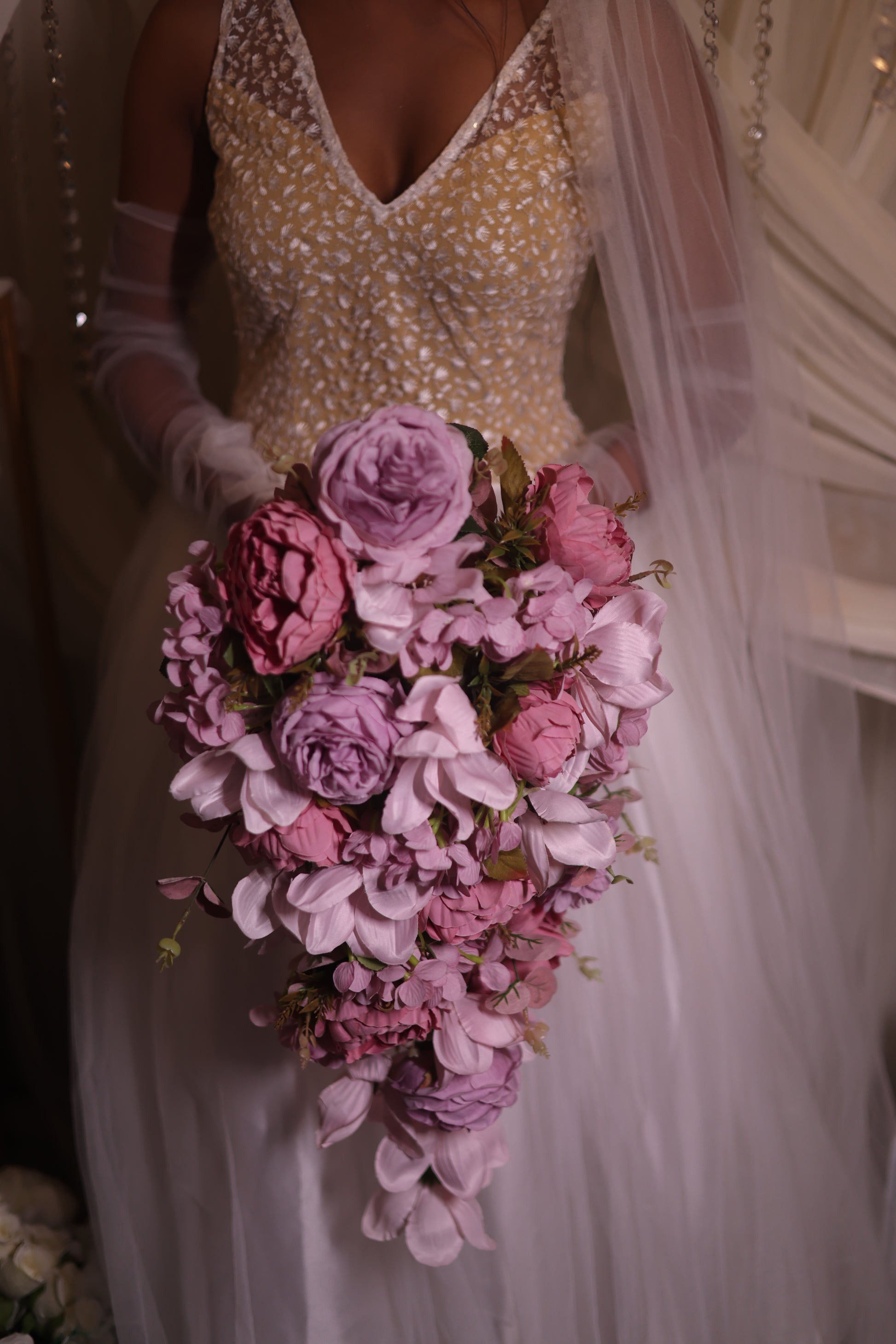 Make a breathtaking entrance with the Clara Cascade Bridal Bouquet, a romantic and timeless floral masterpiece designed in elegant shades of pink and mauve. This large, hand-crafted artificial bouquet captures the beauty of fresh blooms with the lasting charm of silk flowers, perfect for brides seeking a graceful, cascading silhouette.