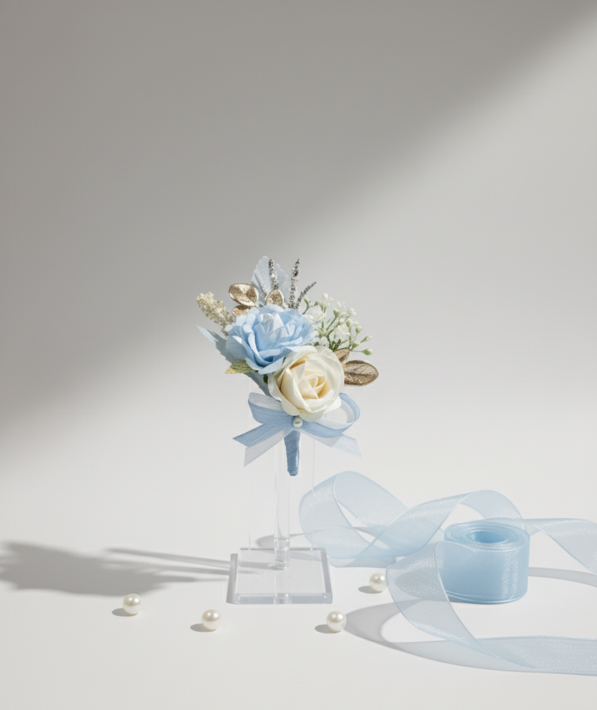 Elegant boutonnière featuring ivory and pastel blue flowers.