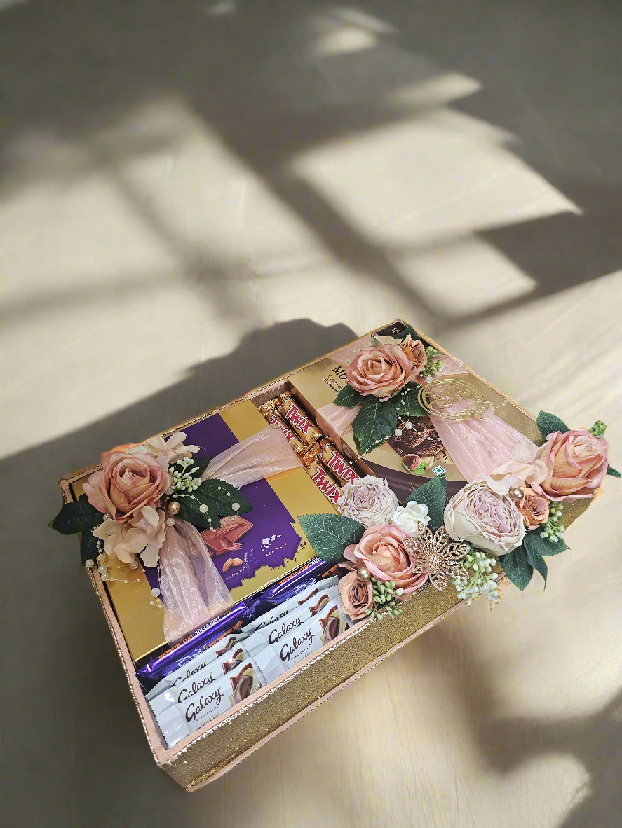 Includes: Choclates, Decorative Florals, Elegant Packaging